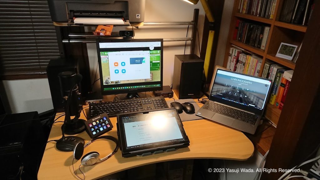 構成のメインで使っているのがWindowsのデスクトップPC(Dell)です。中央にあるモニターの上部に小型の外付けウェブカメラを据え付けています。モニターの左右両サイドにアクティブスピーカーを配置しています。右側の本棚前にあるのがサブデバイスとして使っているWindowsのラップトップPC(Lenovo)です。真ん中手前にあるのはPCのSurfaceです。先月お話した宅外の現場に持ち出して利用しているものですが、在宅でも資料の閲覧とノートテイキング用にそのまま使っています。インターネットの接続は宅内に引き込んだ光回線ですが、デスクトップはONUから有線で直接接続し、ラップトップとSurfaceはWi-Fiで無線接続しています。