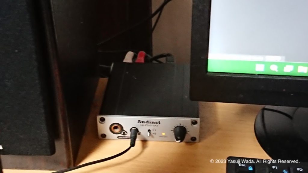 音声の出力については、PCからDAC付きヘッドフォンアンプ(Audinst HUD MX-1)を介して外付けのスピーカーとヘッドフォン両方に接続しています(下の写真参照)。