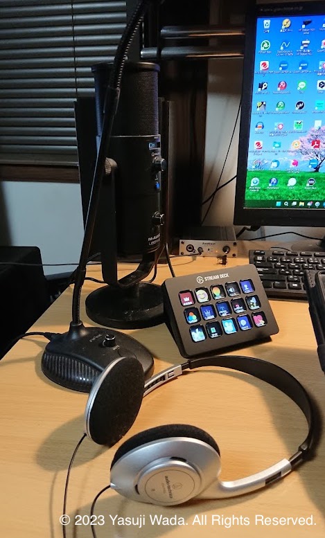 拙宅の場合は、昔からパソコンで趣味の音楽を鑑賞するためアクティブスピーカーやDAC付きヘッドフォンアンプを接続していました。またこの写真には写っていませんが、反対側にオーディオコンポがあります。そちらのアンプへもPCから別のDAC経由で接続しているため、サウンド出力の切り替えなどにSTREAM DECKというデバイスも利用しています(上記写真の左側でマイクとキーボードの間に置かれているボタンがたくさんついた小さい機器です)。このSTREAM DECKは、頻繁に使うアプリやファイルのショートカットを登録してランチャーとしても使える非常に便利なデバイスです。こうした一連の機器は通訳業務とは関係なく使っておりましたが、コロナ禍でのリモート通訳業務に際しとても役立ってくれています。通訳用に新たに購入したものは先述したウェブカメラとマイク2本だけです。