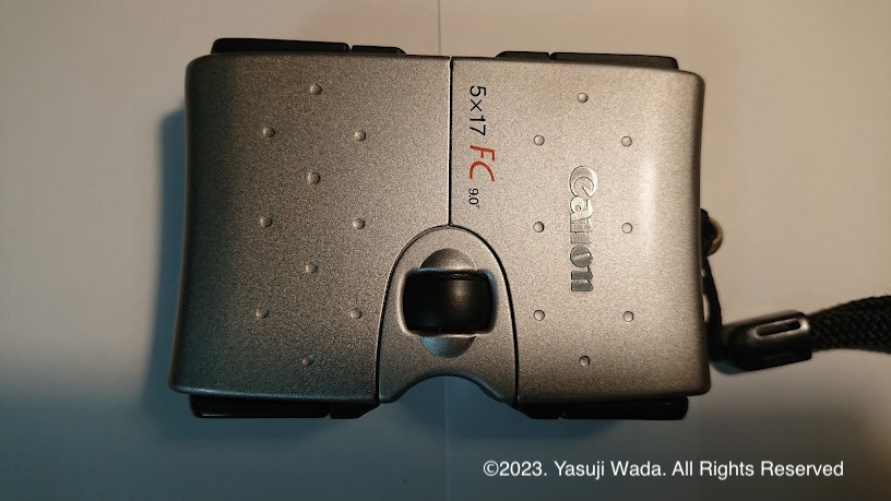 この写真は愛用しているキャノン製の双眼鏡ですが、非常にバランスのよい製品です。「5 x 17 (9.0°)」というのは倍率が5倍、対物レンズ有効径17mm、実視界9°という仕様を表しています。対物レンズ有効径(これはコンパクトタイプなので小さめです)はレンズの明るさを、実視界は視界の広さを示します。この双眼鏡は、通訳現場で丁度見易い実視界の仕様になっています。さらに表示はされていませんが、この双眼鏡はアイレリーフという仕様が14mmです。これは接眼レンズから眼をはなしていても視野全体を見ることができる距離を示し、眼鏡を掛けている人は14mmか15mmを選ぶのがよいと言われています。