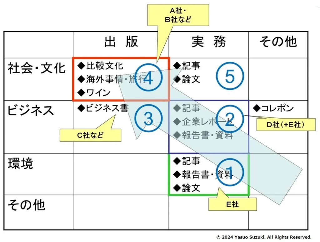先ほどの図に戻ると、「出版」「実務」「その他」という種別を横方向に、「社会・文化」「ビジネス」「環境」「その他」という分野を縦方向に並べました。スタート地点は①の「実務翻訳×環境分野」、目ざすゴールは④の「出版翻訳×社会・文化分野」です。