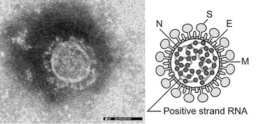 新型コロナウイルスの電子顕微鏡写真(左)とその模式図(右)