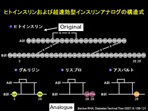 そこで、注射してから短時間で血中に拡散する様にアミノ酸配列を人工的に変えたアナログ製剤(図の下半分:グルリジンやリスプロなどは製品名)が発売されています。見た目はよく似ていますが、その働きには大きな違いがあります。