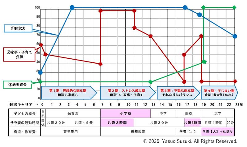 こう書いても、ライフステージによって生活がどう変化し、どんな風に翻訳業に影響するかが、特に若い方々にはイメージしにくいでしょう。そこで、私の経験を例に図解してみます。